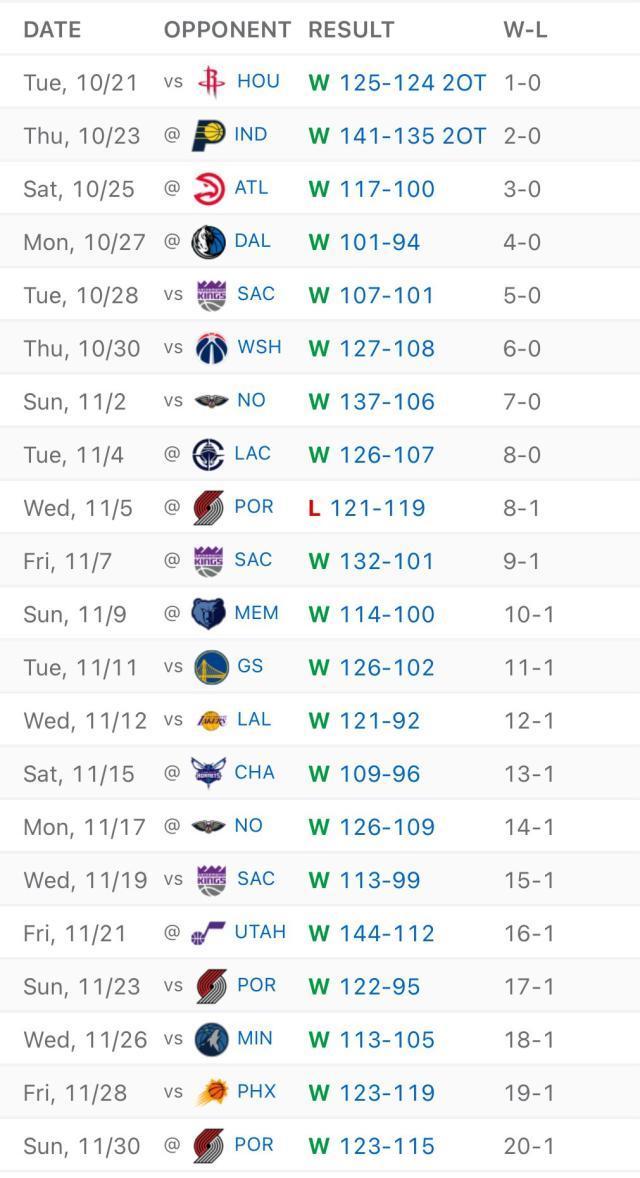 北京时间12月1日,客场面对本赛季唯一击败过自己的开拓者队,雷霆靠着末节的关键球决胜以123比115击败对手,豪取12连胜。此役过后,雷霆本赛季战绩已经来到20胜1负,他们成为了NBA历史第4支开局前21场赢下至少20场的队伍。