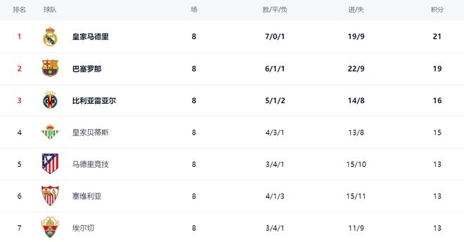 在积分榜上,皇马以21分高居榜首。巴萨输球,依然是19分,只能排名第2。比利亚雷亚尔以16分排名第3。第4的是皇家贝蒂斯,拿到15分。而马竞只拿到13分,排名第5。塞维利亚、埃尔切和毕尔巴鄂竞技也都是13个积分,排名第6到第8。